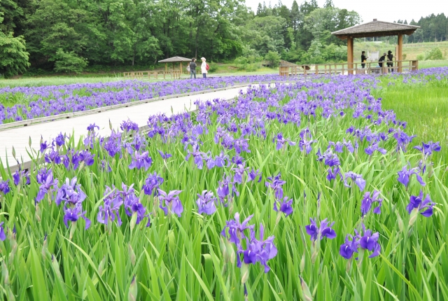 見頃を迎えたカキツバタ。紫色の花が池を彩っている=27日、柏崎・夢の森公園 (2011/05/27)