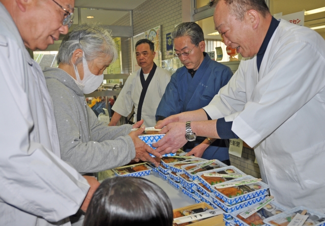 精進ずしで支援をと、避難所の被災者に贈る柏崎寿司(すし)商組合=14日、中央コミセン (2011/04/15)