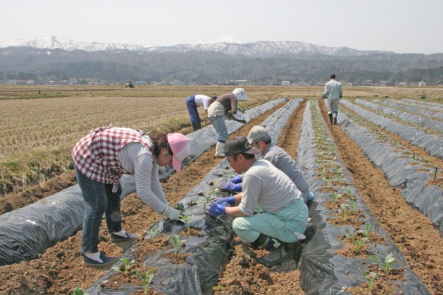 残雪の米山を望みながら、春ブロッコリーの苗の植え付け作業=市内藤橋 (2011/04/16)