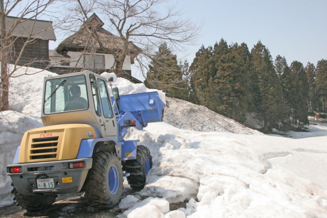 農道を確保するため、重機で除雪を行う市内高柳町門出の農家。積雪が多く田植えは例年より遅れる見込みだ=13日 (2011/04/17)