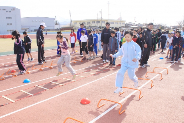 ジュニア陸上教室でミニハードルなどに挑戦する小学生=17日、市陸上競技場 (2011/04/19)