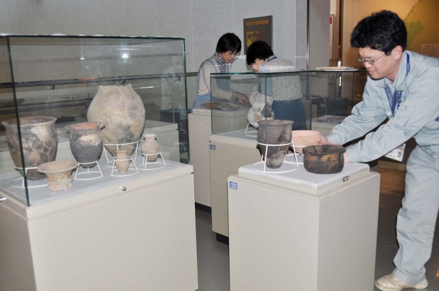 開催準備を進めるミニ展示「下谷地遺跡出土品」=19日、市立博物館 (2011/04/20)