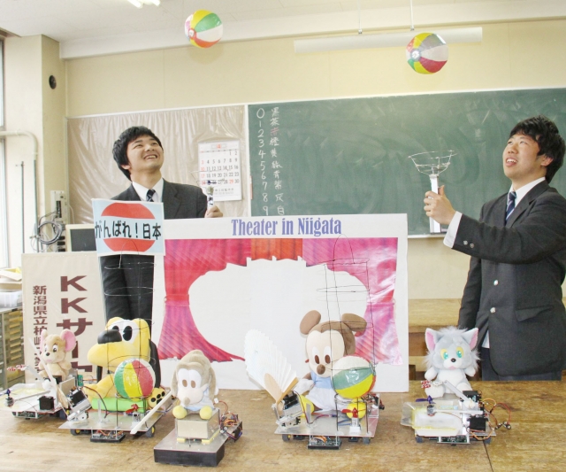 自作ロボット5台でロボカップ全国大会・ダンス部門に出場する吉田君(右)と久住君 (2011/04/21)