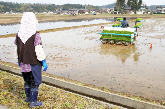 8月下旬の出荷を目指す早期越路早生の田植えがスタート=市内西山町五日市地内 (2011/04/22)