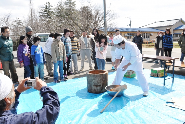 東日本大震災の被災者を励まそうと、市内の避難所の一つ、北鯖石コミセン前で行われたもちつき=3日 (2011/04/04)