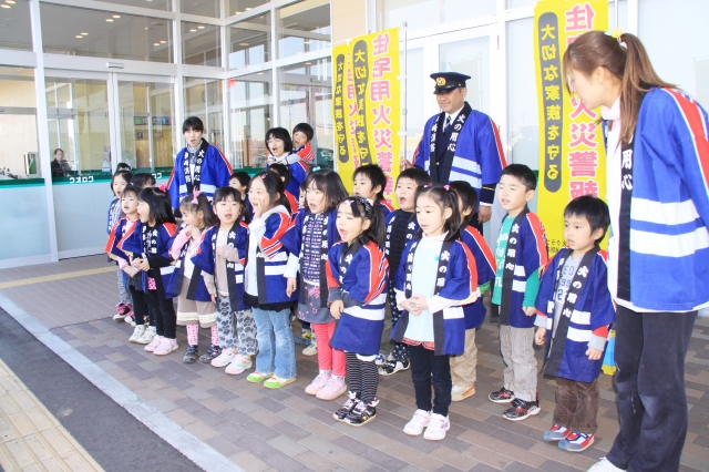 火の用心」を呼び掛けた茨目さくら保育園の幼年消防クラブ=6日、市内宝町、ウオロク柏崎店前 (2011/04/07)