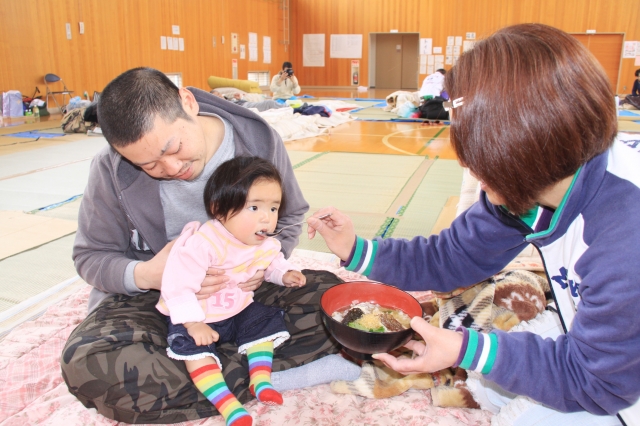 市内避難所で「鯛茶漬け」の炊き出しを味わう家族=8日、北鯖石コミセン (2011/04/08)