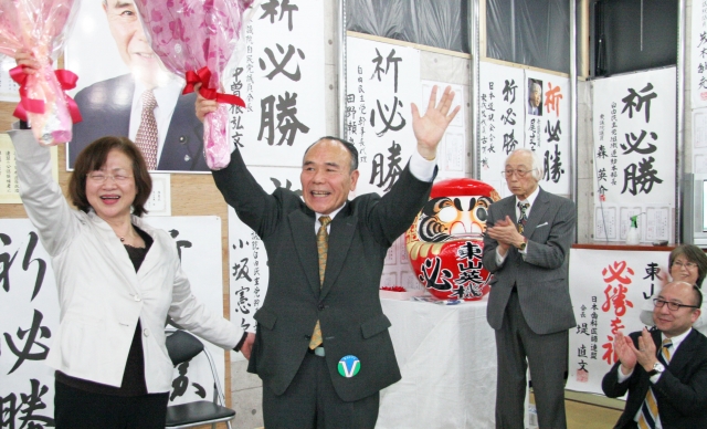 県議選柏崎市刈羽郡区でトップ当選の東山英機氏=市内新田畑の選挙事務所 (2011/04/11)