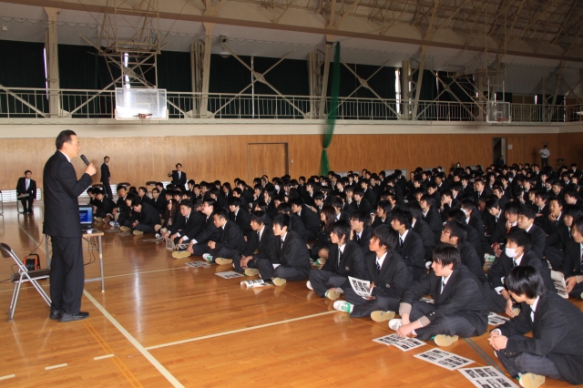 OBを講師に迎え、防災教育講演で災害復旧の体験談を聞いた柏工生=12日 (2011/04/13)