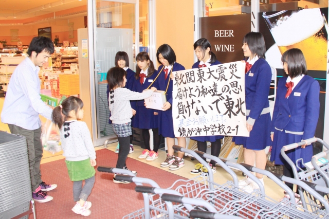 東日本大震災の被災地支援へ街頭募金を行う鏡が沖中生徒=スーパーマルイ柏崎横山店前 (2011/03/23)