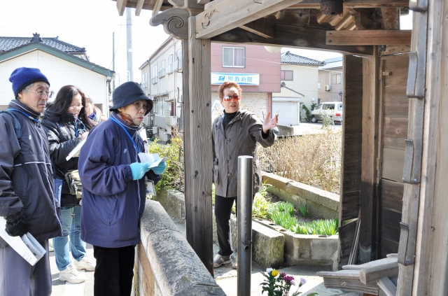 街なか史跡ツアーで旧跡、小路を説明するボランティアガイド=24日、市内西本町2地内 (2011/03/25)