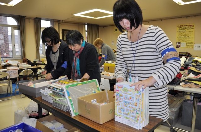 新学期を前に、学用品の協力を求める「支援物資受け渡し所」=25日、市役所会議棟102会議室 (2011/03/26)