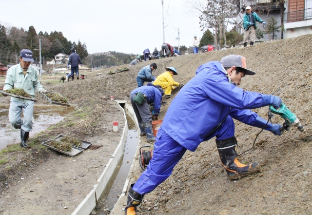 市道拡幅工事を終え、種から育てた芝を植える住民=市内西山町伊毛 (2011/03/28)