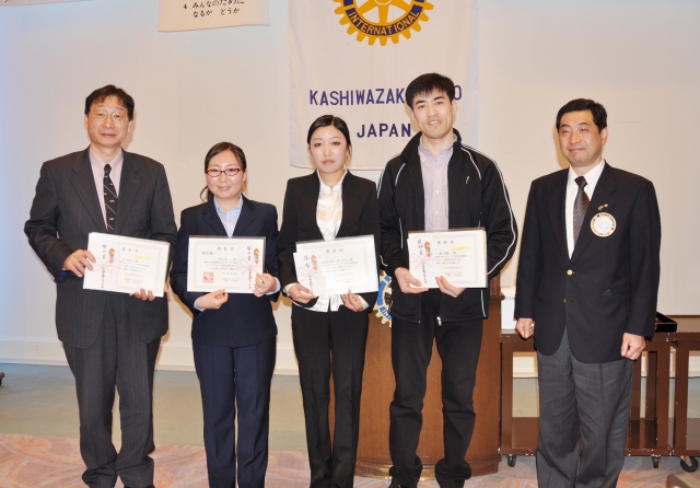 柏崎中央ロータリークラブが行った留学生対象の懸賞論文コンクール表彰入賞者ら=29日、柏崎ベルナール (2011/03/30)