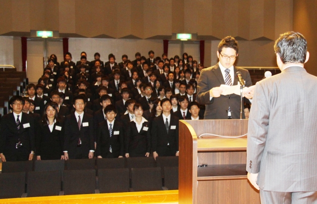 ブルボン入社式で吉田康社長に決意を述べる新入社員=産文文化ホール (2011/04/01)