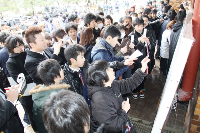 小雪が舞い散る中で行われた市内高校の合格発表=11日午後2時ごろ、柏工 (2011/03/11)