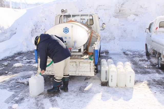 市内高柳町石黒地区に配置された給水車=12日、同町石黒地域活動拠点施設 (2011/03/12)