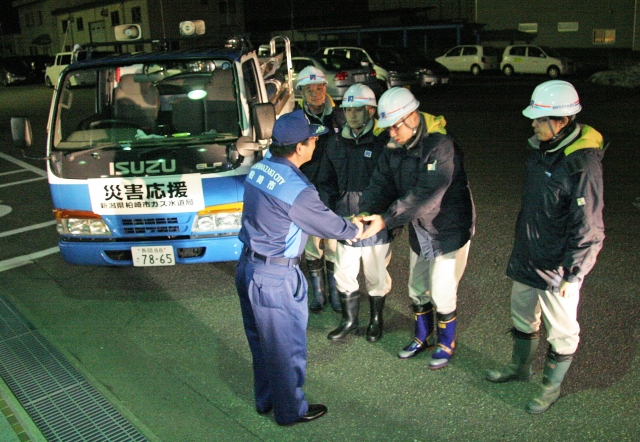 被災地の給水支援出発で、会田市長から握手の激励を受ける派遣職員=市ガス水道局 (2011/03/14)