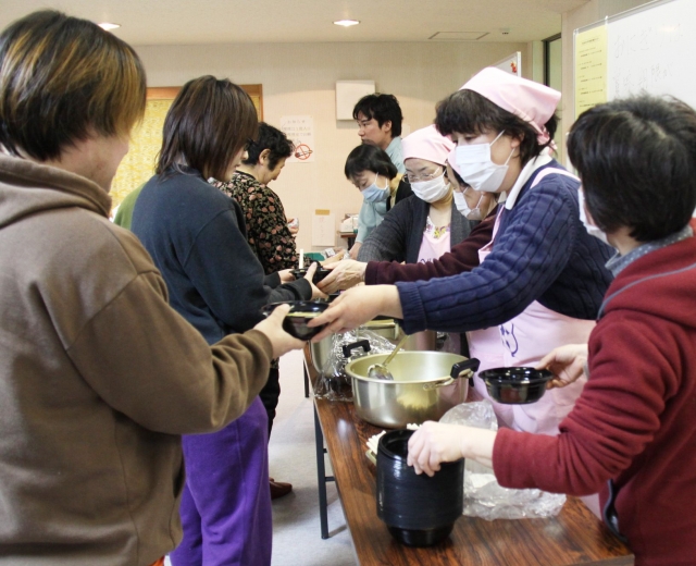刈羽村にも開設された東日本大震災の避難所。炊き出しを行う地元食生活改善推進委員=17日、村老人福祉センター (2011/03/18)