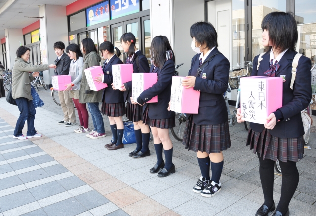 東日本大震災支援へ街頭募金を行う高校生=19日、市内東本町1のフォンジェ前 (2011/03/19)