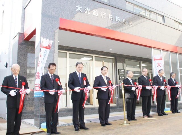 新築工事が完成した大光銀行柏崎支店でテープカットを行う頭取ら=22日 (2011/03/22)