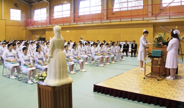 新潟病院附属看護学校で行われた卒業式。富沢校長から一人ひとりに証書が手渡された=2日 (2011/03/02)