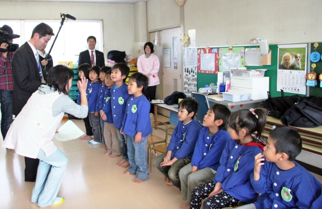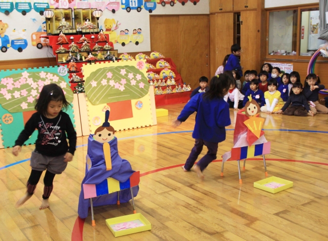 ひな祭りの3日、ゲームを楽しむ東部保育園の園児たち (2011/03/03)