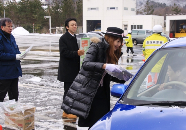 北陸自動車道下り線米山SAで安全運転を呼び掛けるハイウエーレディー=4日 (2011/03/04)