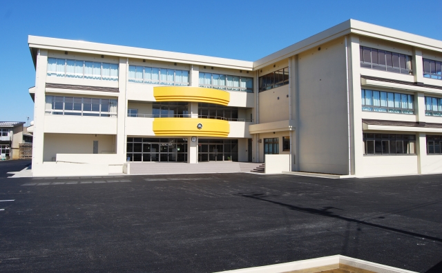 2カ年継続工事で完成した枇杷島小の新校舎。地名にちなみ、枇杷色をアクセントにした外観は学びやにふさわしい雰囲気だ (2011/02/22)