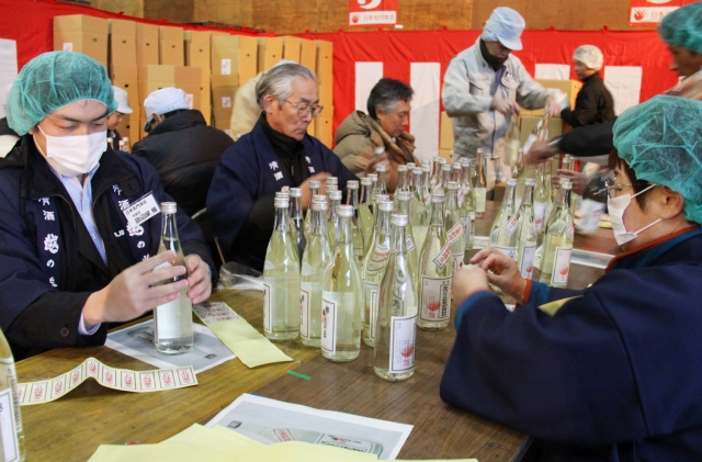 自ら瓶詰めをした「立春の酒」にラベルを張る酒販店主=4日朝、市内新橋原酒造 (2011/02/04)