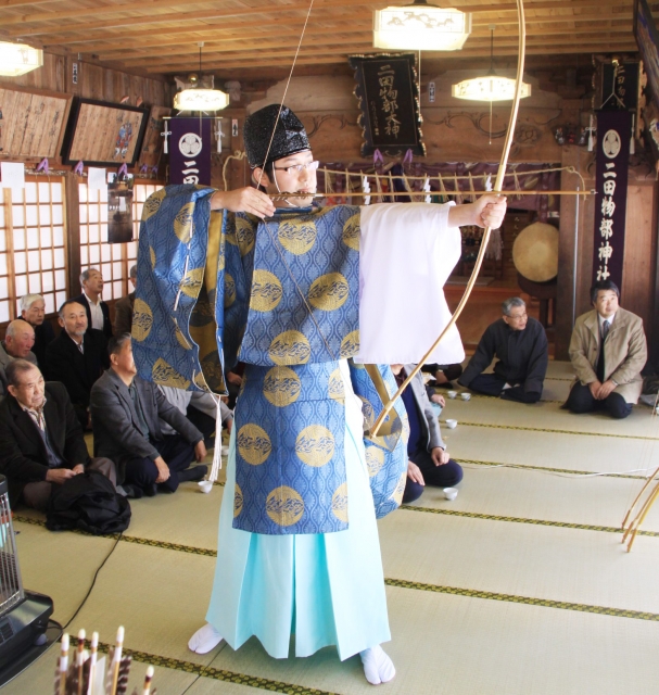 御弓始(おゆみはじめ)祭りで神矢を放つ三嶋禰宜=西山・二田物部神社 (2011/02/08)