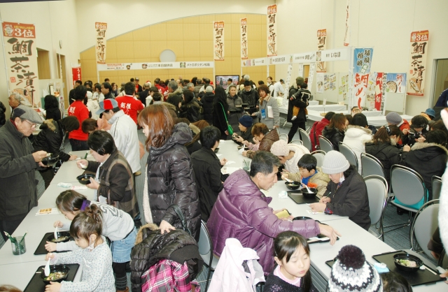 盛況で入場制限も行われた「どんぶり選手権」感謝の集い=11日、市民プラザ (2011/02/12)