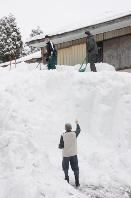 2階の屋根近くまで達した雪をスノーダンプで取り除く連合東京青年委員会=市内高柳町 (2011/02/14)