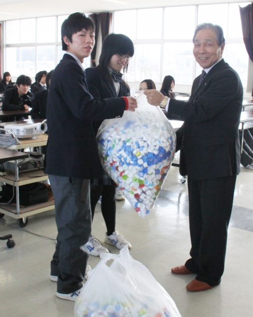 NPO事務局長からエコキャップ活動の感謝状を受けた産大附属高校の生徒 (2011/02/15)