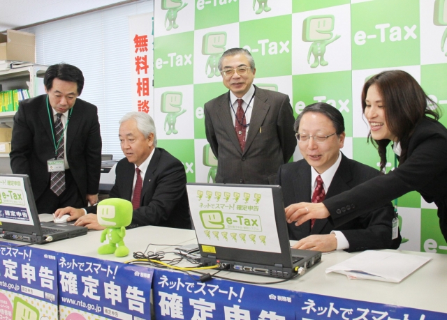 電子申告システムで入力する会田市長(右)と品田村長=16日、柏崎税務署 (2011/02/16)