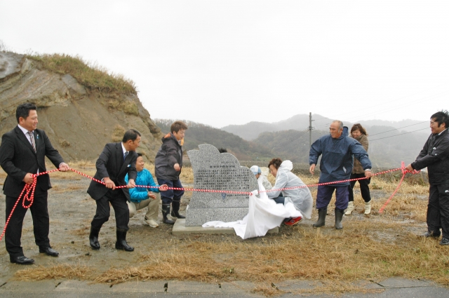 悪天候の中で行われた松田伝十郎の「まちしるべ」の除幕式 (2010/11/26)