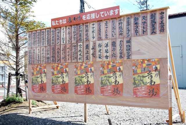 「音市場」の開催をPRするユニークな看板。応援事業所の名前がずらり並んだ=市内東本町2地内 (2010/09/15)