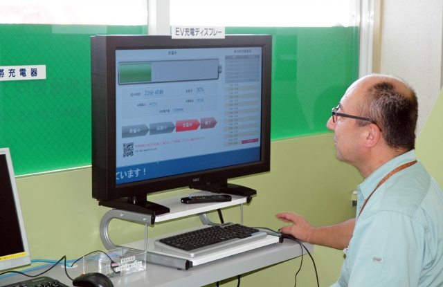 電気自動車の充電予約と充電の状況を表示するディスプレー=市内松波2の品田商会 (2010/09/16)