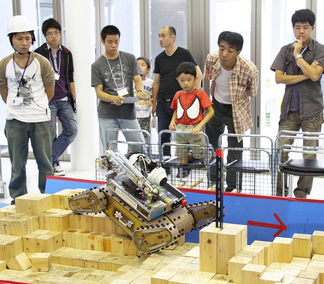 災害現場を模したフィールドでカメラを通じ遠隔操作で進む救助ロボット=新潟工科大食堂 (2010/09/21)