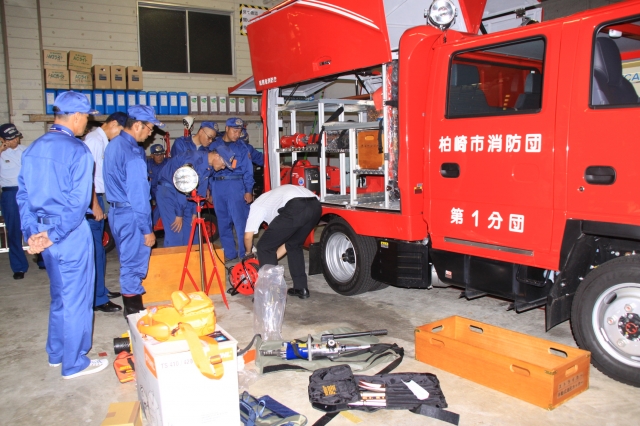 消防庁から市消防団に無償貸与された多機能型消防車の引き渡し式。救助資機材を搭載している=21日、市消防本部 (2010/09/24)
