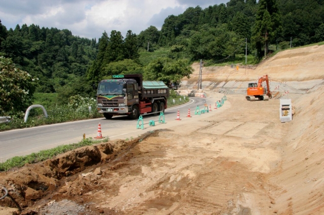 道路脇の山を削り、土砂の搬出が進められている門出の主要地方道松代高柳線 (2010/09/09)