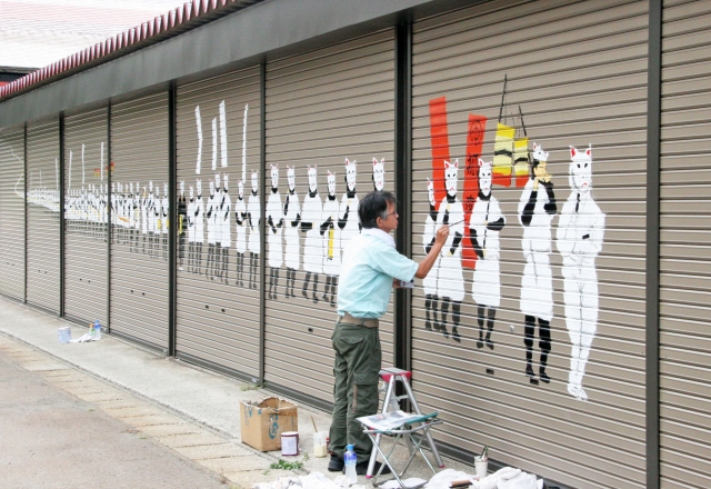 シャッターに「狐の夜まつり」のちょうちん行列の絵を描く吉田直治さん (2010/09/11)