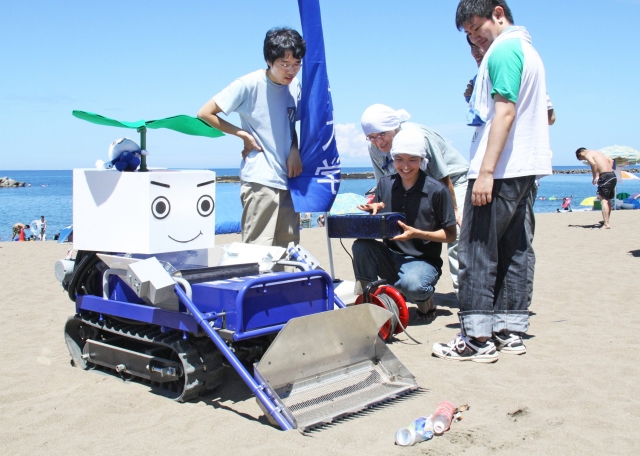 大学マスコットの「つくっ太郎」をデザインした海浜清掃装置の実演を行う工科大生ら (2010/08/11)