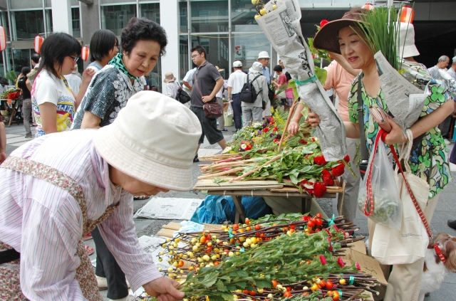 お盆を前にしてにぎわった伝統の花市=市民プラザ前 (2010/08/12)