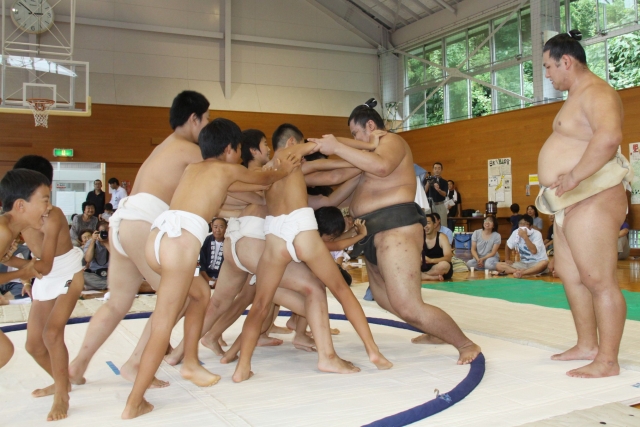 大相撲の花籠部屋から十両力士らも参加した西山田沢の奉納相撲=14日、中川コミセン (2010/08/16)
