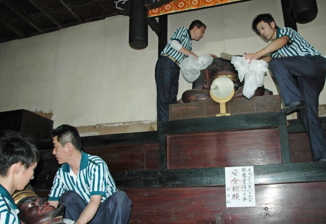 本格的な修復工事が始まった閻魔堂。大王像は頭、胴、足の部分に分け、仮堂へ引っ越し (2010/08/19)