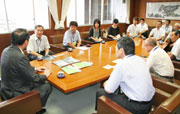 会田市長(左)と懇談する東村山市の学校給食関係者=市役所市長応接室 (2010/07/31)