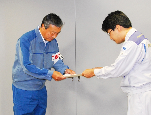 1号機の定期検査終了証を保安院から交付される横村・東京電力柏崎刈羽原発所長(左) (2010/08/05)