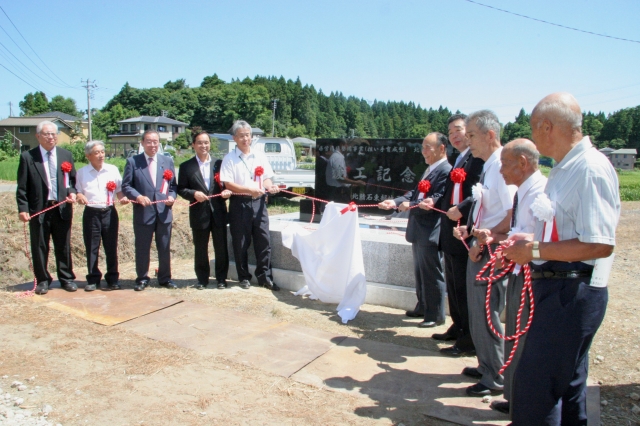 北鯖石東部地区で1ヘクタールの大規模ほ場整備が終了し、関係者が除幕した竣工記念碑 (2010/08/06)