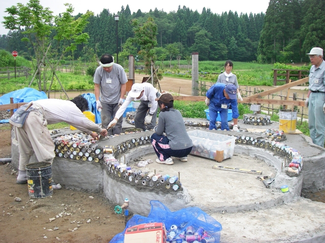空き缶を使った足湯の浴槽づくりに取り組む手作り建築講座の参加者=柏崎・夢の森公園 (2010/08/09)